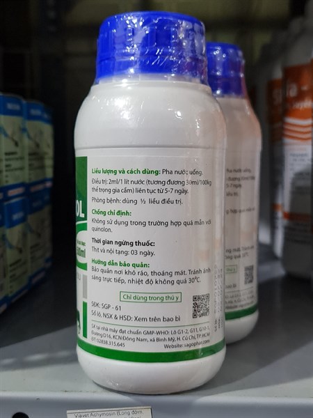 Pha nước uống: 2ml/1 lít nước (tương đương 30ml/100kg thể trọng gia cầm) liên tục từ 5-7 ngày.