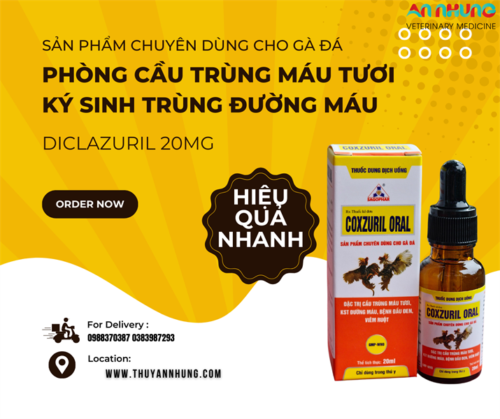 Gà đá ủ rũ, kém ăn, tiêu chảy ra máu?Sức khỏe gà suy giảm, phong độ thi đấu đi xuống?Nguy cơ gà mắc bệnh cầu trùng và ký sinh trùng đường máu cao?Đừng để những lo lắng này ảnh hưởng đến chiến kê của bạn! COXZURIL ORAL AN NHUNG – GIẢI PHÁP PHÒNG VÀ TRỊ BỆNH HIỆU QUẢ NHẤT!