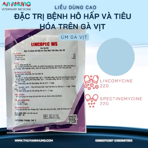 Liều lượng và cách dùng: Pha nước uống hoặc trộn thức ăn. Điều trị: 1g/1 lít nước hoặc 2g/1kg thức ăn (tương đương 15g/100kg thể trọng gia cầm) liên tục từ 5-7 ngày.
