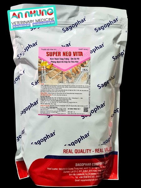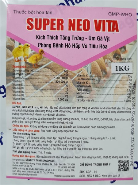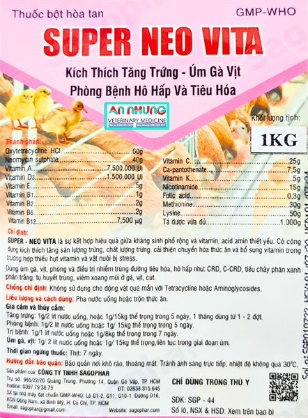 – SUPER – NEO VITA là sự kết hợp hiệu quả giữa kháng sinh phổ rộng và vitamin, acid amin thiết yếu. Có công dụng kích thích tăng sản lượng trứng, chất lượng trứng, cải thiện chuyển hóa thức ăn và bổ sung vitamin trong trường hợp thiếu hụt vitamin và vật nuôi bị stress.