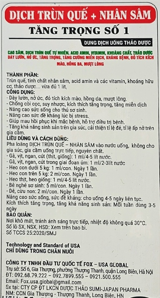 SUMI DỊCH TRÙN QUẾ + NHÂN SÂM (Tăng trọng số 1) – 1 lít – Can