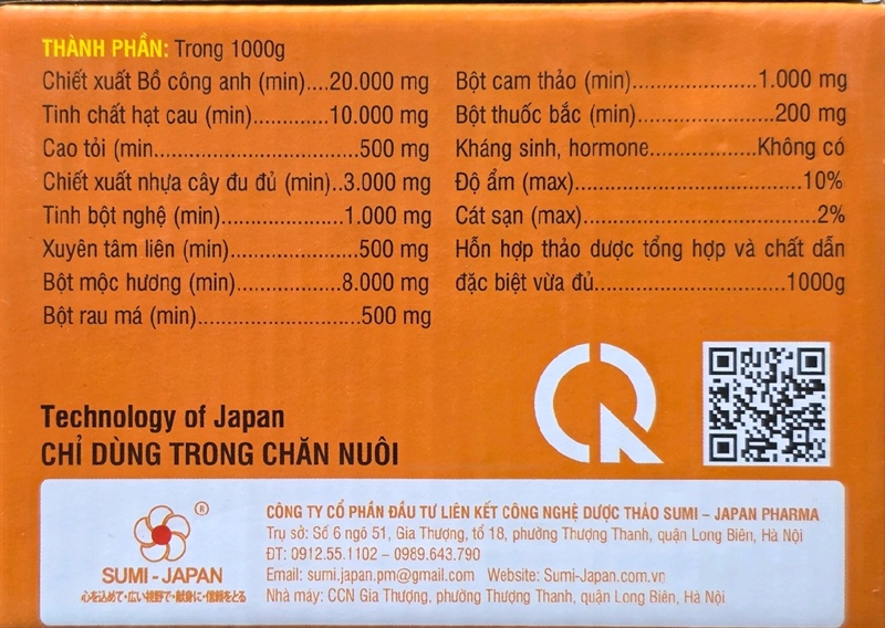 Sản phẩm là hỗn hợp thảo dược, không chứa kháng sinh hay hormone. Các thành phần chính bao gồm: