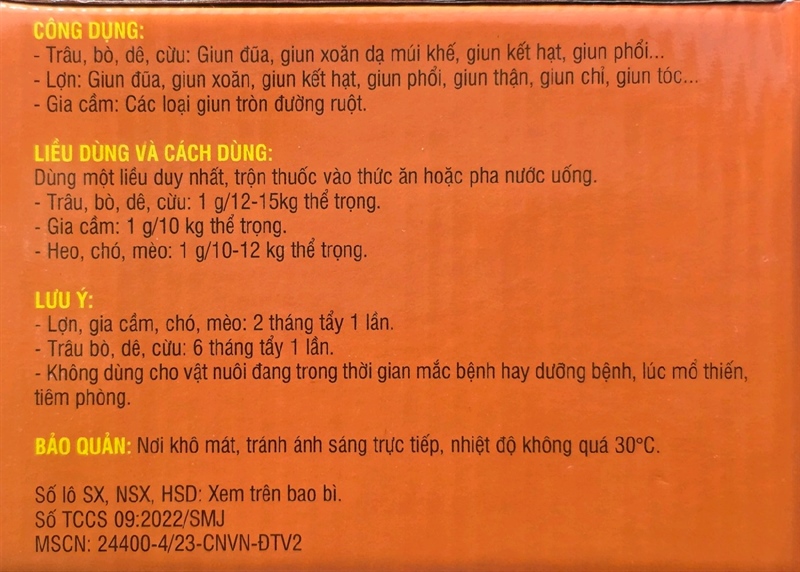 ✅ Hỗ trợ làm sạch các loại giun sán như giun đũa, giun xoăn, giun phổi, giun kết hạt, giun thận, giun chỉ, giun tóc trên trâu, bò, dê, cừu, lợn, chó, mèo và các loại giun tròn đường ruột ở gia cầm.