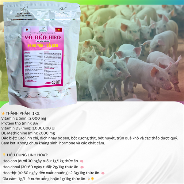 Sản phẩm VỖ BÉO HEO – TĂNG TỐC – VỖ BÉO được thiết kế để bổ sung dinh dưỡng, giúp heo tăng trọng nhanh và khỏe mạnh. Dưới đây là hướng dẫn sử dụng hợp lý:
