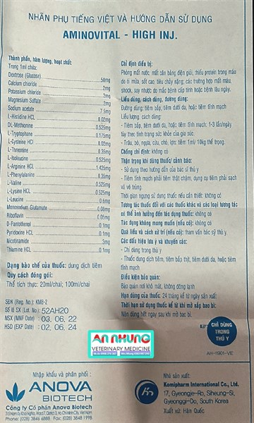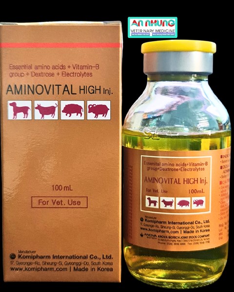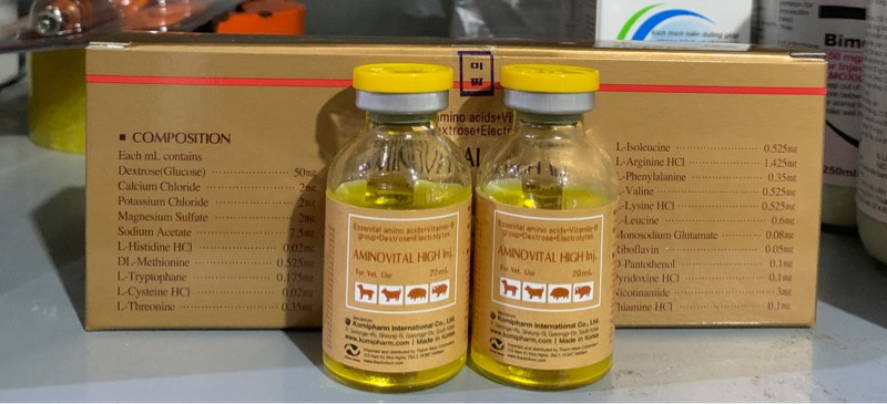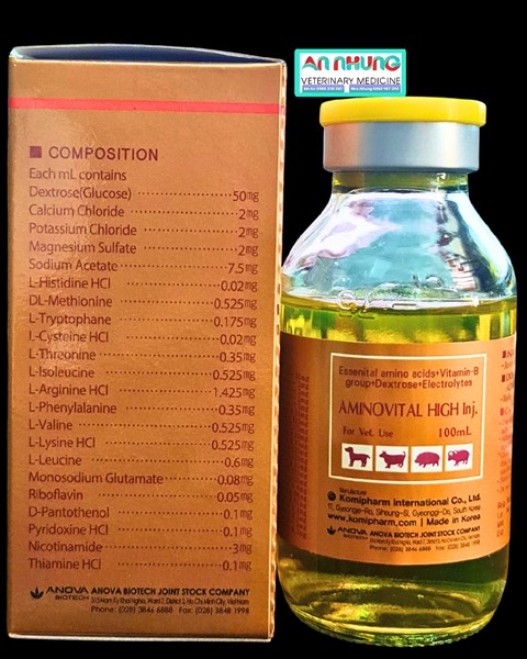 Dextrose (Glucose)……………………………….50mgCalcium chloride……………………………………2mgPotassium chloride…………………………………2mgMagnesium sulfate…………………………………2mgSodium acetate……………………………………7.5mgL-Histidine HCl………………………………….0.02mgDL-Methionine…………………………………0.525mgL-Trytophane…………………………………..0.175mgL-Cysteine HCl………………………………….0.02mgL-Threonine………………………………………0.35mgL-Isoleucine…………………………………….0.525mgL-Arginine HCl…………………………………1.425mgL-Phenylalanine…………………………………0.35mg.L-Valine…………………………………………..0.525mgL-Lysine HCl……………………………………0.525mgL-Leucine……………………………………………0.6mgMonosodium Glutamate……………………..0.08mg.Riboflavin…………………………………………0.05mgD-Pantothenol……………………………………..0.1mgPyridoxine HCl……………………………………0.1mgNicotinamide…………………………………………3mgThiamine HCl……………………………………..0.1mgDẠNG BÀO CHẾ VÀ QUY CÁCH: dung dịch tiêm, chai 20ml, 100ml