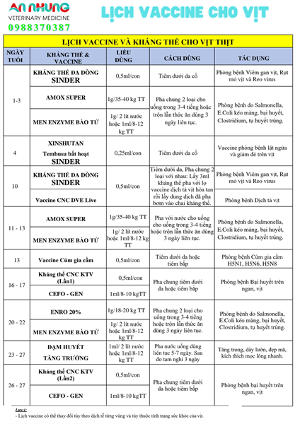 Lịch tiêm phòng vaccine cho vịt thịt được khuyến cáo như sau:- 1 ngày tuổi: Vaccine phòng bệnh Viêm gan vịt & bệnh Rụt mỏ vịt – 1-3 ngày tuổi: Kháng thể/Vaccine phòng E.coli (bệnh viêm rốn, tiêu chảy) – 7 ngày tuổi: Vaccine Tembusu (hội chứng giảm đẻ & lật ngửa do Tembusu virus) – 10 ngày tuổi: Vaccine Dịch tả vịt (mũi 1) – 12 ngày tuổi: Vaccine phòng Cúm gia cầm (lần 1)- 13-15 ngày tuổi: Vaccine phòng E.coli, thương hàn vịt- 21-23 ngày tuổi: Vaccine phòng bệnh E.coli, thương hàn & Tụ huyết trùng- 35 ngày tuổi: Vaccine phòng bệnh Tembusu (hội chứng giảm đẻ) (lần 2)- 38 – 40 ngày tuổi: Vaccine phòng dịch tả vịt (lần 2)- 45 ngày tuổi: Vaccine phòng cúm gia cầm (lần 2)