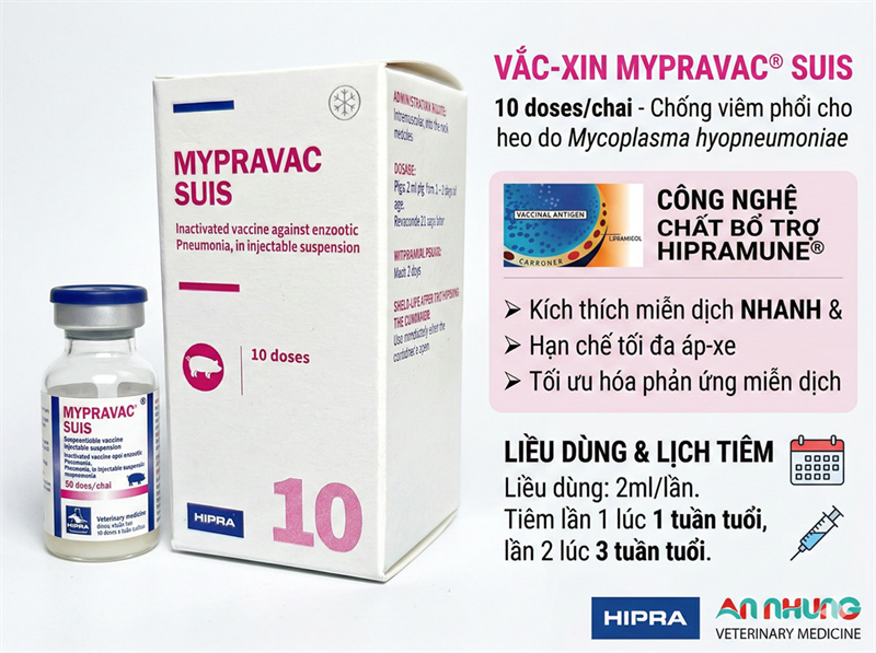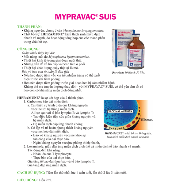 Các trại có tỷ lệ mắc bệnh viêm phổi địa phương cao : tiêm 1 liều 2ml/ con vào lúc heo được 7- 10 ngày tuổi. Tiêm nhắc lại sau 21 ngàyCác trại có tỷ lệ mắc bệnh viêm phổi địa phương thấp : tiêm 1 liều duy nhất 2ml / con vào lúc heo 5 tuần tuổi Nên để vắc xin nhiệt độ khoảng 15-20oC trước khi tiêm và lắc đều trước khi tiêm KHUYẾN CÁO DÙNG VẮC XIN ĐÚNG CÁCH:
