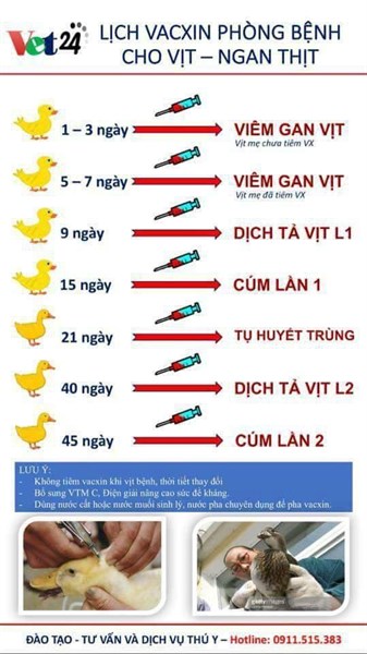 + Vịt, ngan thịt: Tiêm vào lúc 1 – 3 ngày tuổi (0,3 ml/ con).