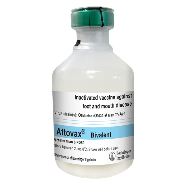 AFTOVAXVắc xin phòng bệnh Lở mồm long móngĐối Tượng Sử Dụng : Trâu, Bò, Dê, Cừu Dạng Bào Chế : Vắc xin vô hoạt keo phèn Quy Cách : Chai 20 ml (10 liều), 50 ml (25 liều), 100 ml (50 liều). Nhà Sản Xuất : Boehringer Ingelheim Nơi Sản Xuất : Anh – Pháp San chia – Phân phối : NAVETCO Mô tảVắc xin vô hoạt keo phèn được sản xuất từ vi rút Lở mồm long móng chứa một hoặc nhiều chủng huyết thanh.