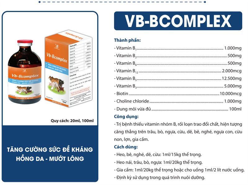 Bạn muốn vật nuôi luôn khỏe mạnh, lông mượt, da hồng hào? VB B-COMPLEX là sản phẩm vitamin tổng hợp thiết yếu, giúp vật nuôi phục hồi nhanh chóng và phát triển toàn diện, đặc biệt trong các giai đoạn căng thẳng.