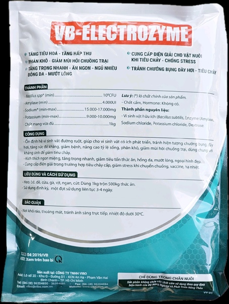 VB-ELECTROZYME là công thức độc đáo kết hợp điện giải thiết yếu và enzyme tiêu hóa, giúp vật nuôi phục hồi nhanh chóng sau stress, bù đắp mất nước, đồng thời tăng cường khả năng tiêu hóa và hấp thu dưỡng chất. Sản phẩm không chỉ giúp vật nuôi ăn ngon, tăng trọng nhanh, lông bóng mượt mà còn cải thiện chất lượng phân và giảm mùi hôi chuồng trại.