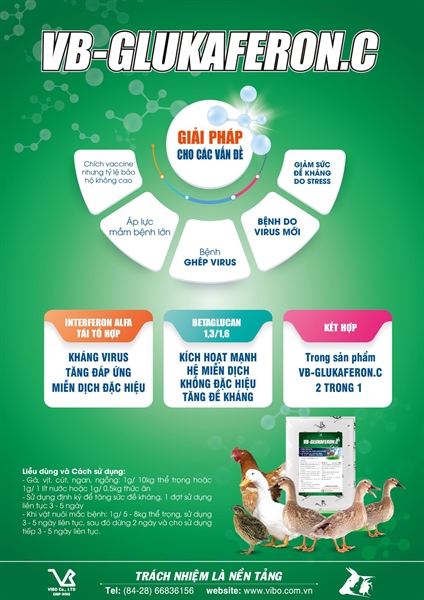 sản phẩm VB-GLUKAFERON.C này là dòng cao cấp hơn hẳn nhờ sự kết hợp của Interferon và Beta Glucan. Đây là “cặp đôi vàng” trong việc khống chế virus mà người chăn nuôi rất quan tâm.