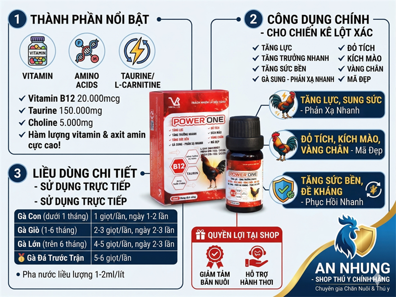 [BOM TẤN] Dung Dịch POWER ONE (Vitamin B12 + Taurine) – Tăng Sức Bền, Kích Mào, Giúp Gà Mau “Căng” & Phục Hồi Nhanh Sau Đá