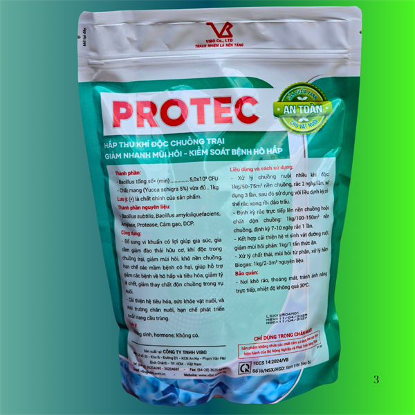 Sản phẩm PROTEC (Dạng bột 1KG) với công thức đặc biệt từ Chiết xuất Yucca và Hệ vi sinh mạnh mẽ là giải pháp toàn diện cho môi trường chăn nuôi.
