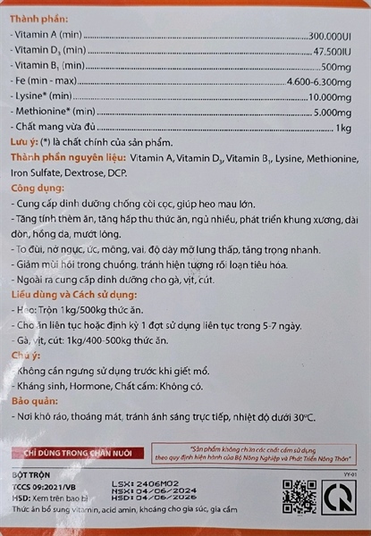 Tăng trưởng vượt trội: Bổ sung Vitamin A, D₃, B₁, B₆ giúp vật nuôi phát triển khung xương chắc khỏe, tăng trọng nhanh chóng.