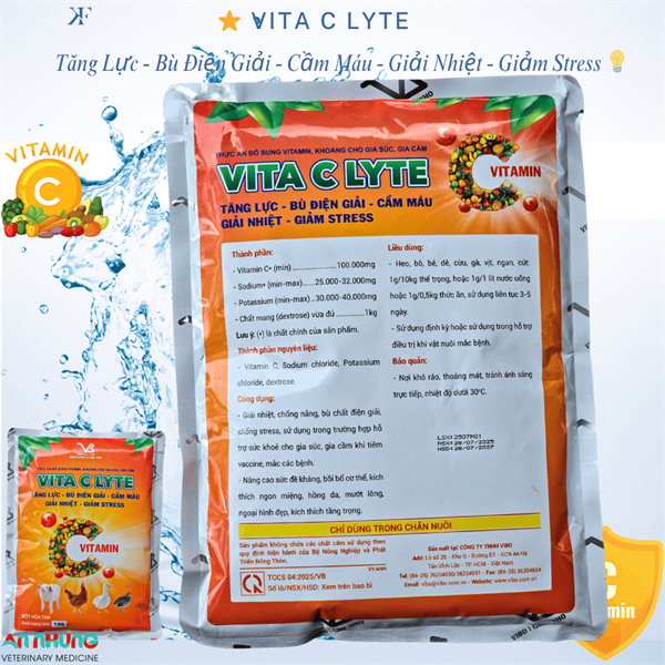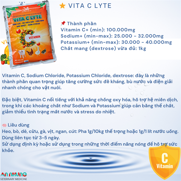 Phân tích thành phần: * Vitamin C, Sodium Chloride, Potassium Chloride, dextrose: đây là những thành phần quan trọng giúp tăng cường sức đề kháng, bù nước và điện giải nhanh chóng cho vật nuôi. Đặc biệt, Vitamin C nổi tiếng với khả năng chống oxy hóa, hỗ trợ hệ miễn dịch, trong khi các khoáng chất như Sodium và Potassium giúp cân bằng thể chất, giảm thiểu tình trạng mất nước và stress do nhiệt.