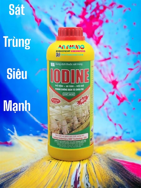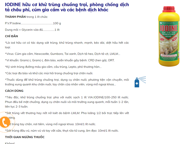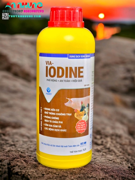 IODINE hữu cơ khử trùng chuồng trại, phòng chống dịch tả châu phi, cúm gia cầm và các bệnh dịch khácTHÀNH PHẦN trong 1 lít chứa:P.V.P.Iodine…………………………………..100 gDung môi + Glycerin vừa đủ……………..1 lítCHỈ ĐẪN*Là iod hữu cơ có tác dụng sát trùng, khử trùng nhanh, mạnh, kéo dài, diệt hầu hết các loại:*Virus: Cúm gia cầm, Newcastle, Gumboro, Tai xanh, Dịch tả heo, Dịch tả vịt, LMLM…*Vi khuẩn: Gram(-), Gram(-), đơn bào, xoắn khuẩn gây bệnh: CRD (hen gà), ORT.*Ký sinh trùng đường máu gia cầm, cầu trùng, Lepto, phó thương hàn…*Các loại đa bào và khử các mùi hôi trong chuồng trại chăn nuôi.*Thuốc dùng để khử trùng chuồng trại, dụng cụ chăn nuôi, phương tiện vận chuyển, môi trường xung quanh khu chăn nuôi, tay chân của nhân viên, vùng mổ ngoại khoa…CÁCH DÙNG*Tiêu độc, khử trùng chuồng trại: pha với nước sạch 1 lít VIA.IODINE/100-250 lít nước. Phun đều bề mặt chuồng, dụng cụ chăn nuôi và môi trường xung quanh, mỗi tuần 1-2 lần, liên tục 2-3 tuần.*Sát trùng vết thương hay nốt nở loét do bệnh LMLM: Pha loãng 1/2 bôi trực tiếp lên vết thương.*Sát trùng tay chân, nơi tiêm, vùng mổ ngoại khoa: 10ml/1 lít nước.*Sát trùng đầu vú, núm vú và tay vắt sữa, thụt rửa tử cung, âm đạo: 10ml/1 lít nước.THỜI GIAN NGỪNG THUỐCKhông!BẢO QUẢNNơi khô, nhiệt độ dưới 30 độ C, tránh ánh sáng!TRÌNH BÀY: 1 lít, 100 ml