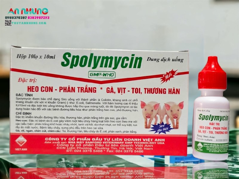 Spolymycin được bào chế dạng Siro uống với thành phần là Colistin, kháng sinh có phổ kháng khuẩn chỉ với vi khuẩn Gram(-) như: E.coli, Salmonella. Với hàm lượng cao 60 triệu IU/100ml và đặc biệt khi uống không được hấp thu qua màng ruột, do đó Spolymycin có tác dụng hoàn hảo đối với các bệnh đường tiêu hóa như: phân trắng heo con, phó thương hàn.