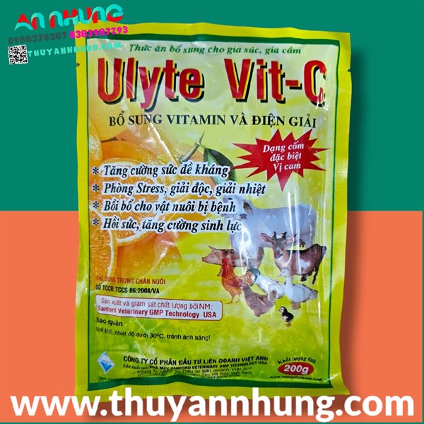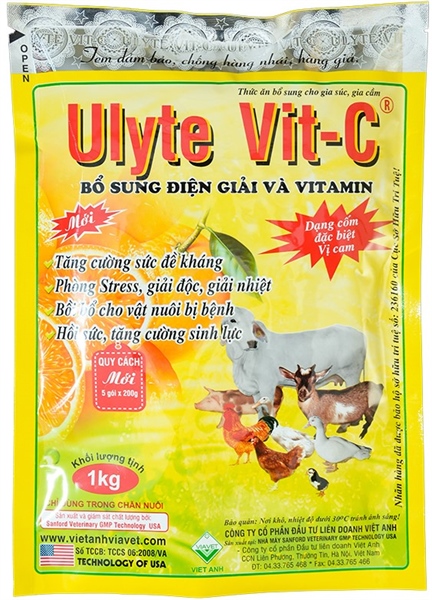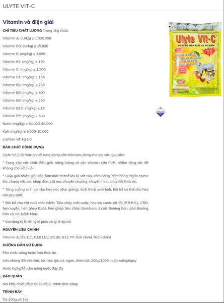 ULYTE VIT-C là một sản phẩm bổ sung toàn diện, cung cấp một loạt các vitamin thiết yếu và chất điện giải. Các vitamin nhóm B và vitamin PP giúp hỗ trợ quá trình trao đổi chất. Vitamin C và E đóng vai trò là chất chống oxy hóa, giúp tăng cường sức đề kháng và giảm stress. Kết hợp với các khoáng chất Natri và Kali, sản phẩm giúp cân bằng điện giải, hỗ trợ vật nuôi phục hồi nhanh sau khi bị sốt, mất nước hoặc tiêu chảy.