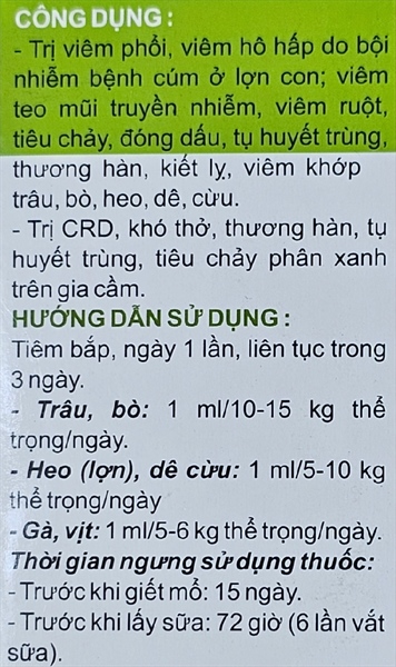 Dùng trị tụ huyết trùng, hô hấp mãn tính (CRD), E.coli, sổ mũi truyền nhiễm, viêm khớp, các bệnh đường tiêu hóa khác.