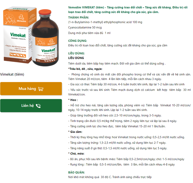 – Phòng chứng vô sinh do mất cân đối phospho trong cơ thể và các vấn đề về hệ sinh sản. Tiêm Vimekat 20 ml/con, tiêm 4 lần liên tiếp, mỗi lần cách nhau 3 ngày.
