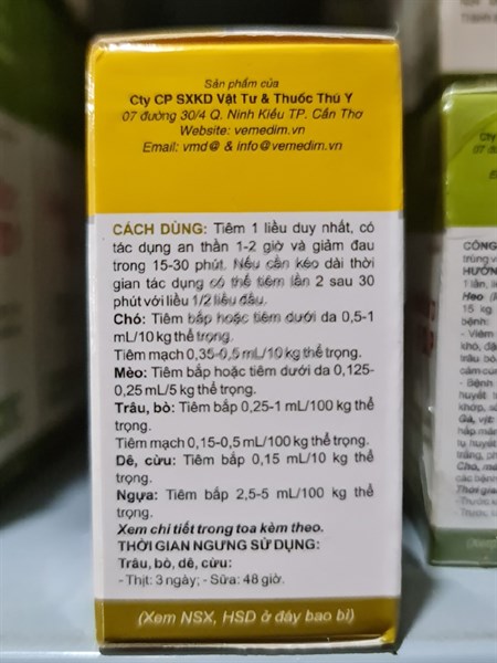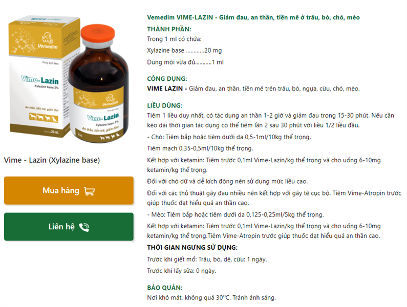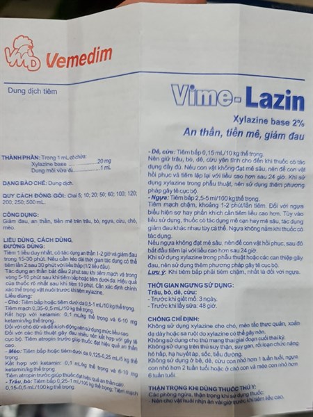 CÔNG DỤNG:VIME LAZIN – Giảm đau, an thần, tiền mê trên trâu, bò, ngựa, cừu, chó, mèo.