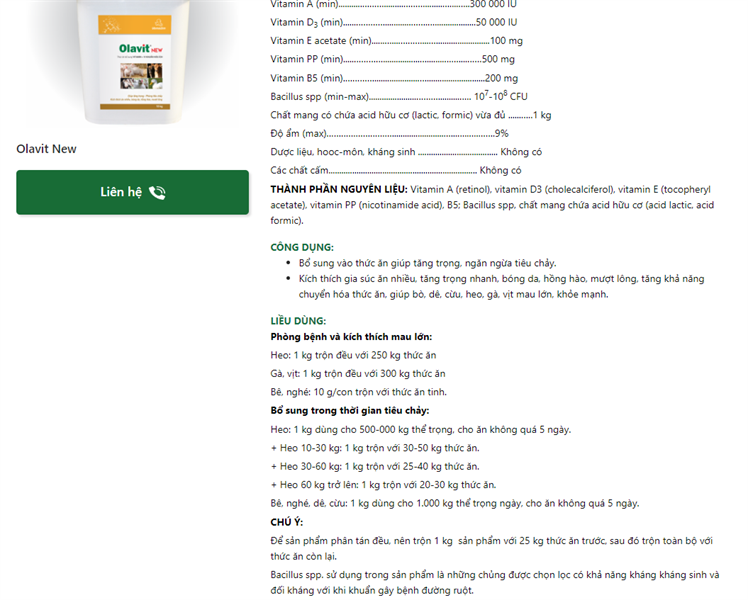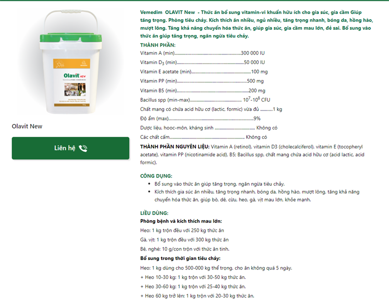 Vemedim OLAVIT New – Thức ăn bổ sung vitamin-vi khuẩn hữu ích cho gia súc, gia cầm Giúp tăng trọng. Phòng tiêu chảy. Kích thích ăn nhiều, ngủ nhiều, tăng trọng nhanh, bóng da, hồng hào, mượt lông. Tăng khả năng chuyển hóa thức ăn, giúp gia súc, gia cầm mau lớn, đẻ sai. Bổ sung vào thức ăn giúp tăng trọng, ngăn ngừa tiêu chảy.