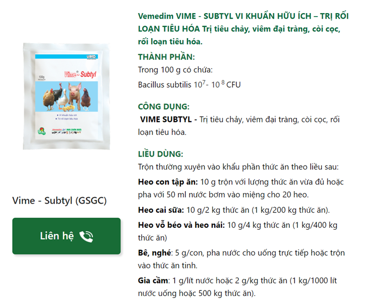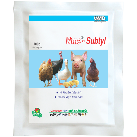 Trị tiêu chảy, viêm đại tràng, còi cọc, rối loạn tiêu hóa.THÀNH PHẦN:Trong 100 g có chứa:Bacillus subtilis 107- 10 8 CFU