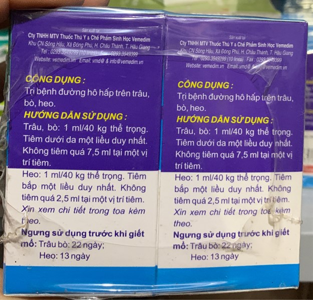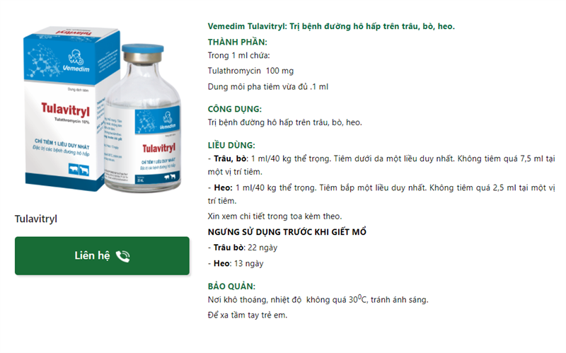 Vemedim Tulavitryl: Trị bệnh đường hô hấp trên trâu, bò, heo.